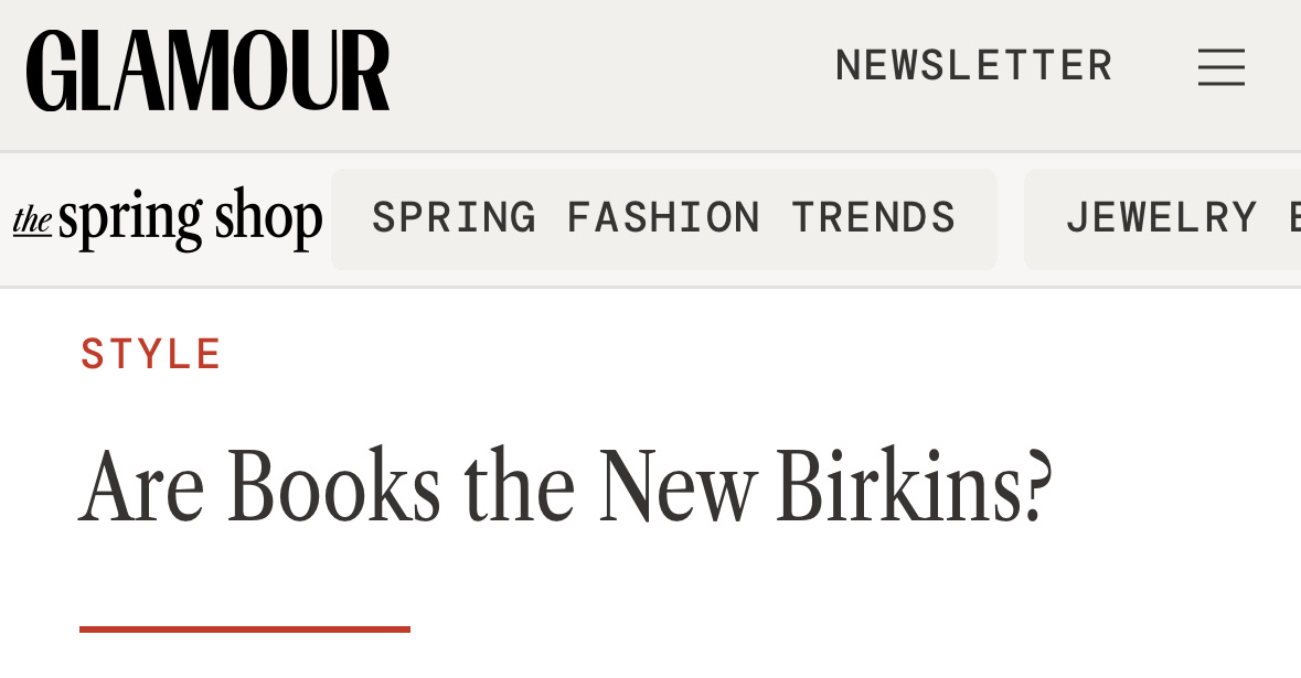 It seems every other day I see headlines, content, and news around new book collaborations, adaptations, or events. Just a few days ago Glamour asked us all, “Are Books the New Birkins?” Personally, I hope so - they’re a lot more affordable.